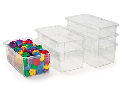 Set of 6 rugged, see-inside plastic bins. Each measures 13 1/2" x 8" x 5" high.
