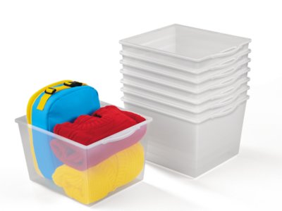 Our sturdy plastic bins with handles are ideal for shoes, lunch boxes and more! Each bin measures 9 1/8" x 11" x 6 3/4" high.