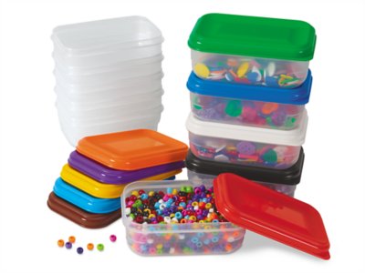 Keep craft supplies neat and tidy with these extra-durable containers! The 10 plastic containers are perfect for storing loose craft items—from beads and buttons to feathers, gems and much more! Containers measure 6 1/4"l x 4"w x 2 1/2"h and include 10 colorful lids.