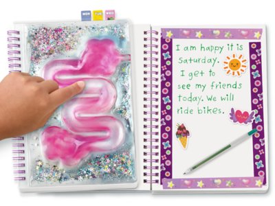 This journal is all about calm, focus and creativity! Featuring a liquid sensory maze on the cover, the journal includes 4 sheets of assorted collage stickers, 3 sheets of alphabet stickers, 3 rolls of decorative tape and a days-of-the-week sticky pad—so kids can design the journal however they want! The blank, spiral-bound journal measures 6 1/4" x 8 1/4" and has 80 drawing and writing pages. Pens sold separately.