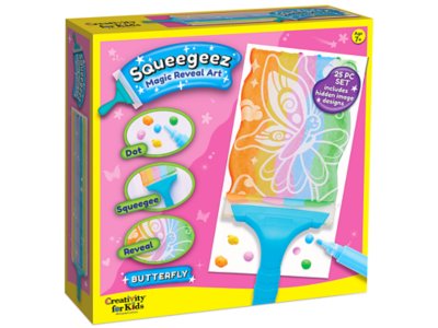 Dot, squeegee, and reveal with this magical painting set! Young artists create butterfly art by applying dots of paint and using the squeegee to reveal 3 whimsical surprise images. Try different painting patterns like zigzags, rainbows and swirls to add texture and effects to your art—and use the holographic stickers for an extra-special touch. Kit includes 5 tubes of acrylic paint, 3 sheets of hidden images, 4 sheets of cardstock, a practice paper pad, holographic stickers, sticky tack, a squeegee tool and instructions; cardstock measures 9" x 5".