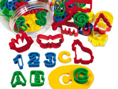 From cars and trucks to dinos, ducks, even a complete alphabet—our giant set of dough cutters has tons of fun shapes! The 63 sturdy plastic cutters are easy for little hands to grip…and they come in a bucket for easy storage. Largest dough cutter measures 3 5/8". Dough sold separately.