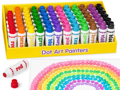These vibrant painters are perfect for creating fun patterns with gentle dabs…or a traditional painted look with long, full strokes! The giant set includes 72 splash-free painters (6 each of 12 different colors) in a convenient storage box—enough for the entire class. Each no-spill bottle is 2.5 fluid ounces.Additional Information