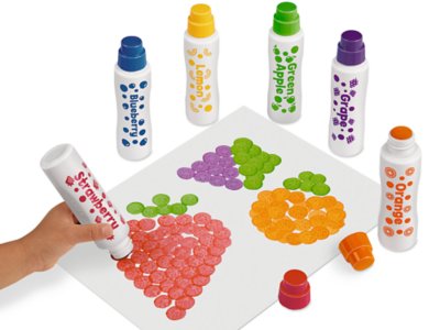 Create dazzling, dotty designs—that smell as good as they look! Kids can gently dab our painters to make fun dot patterns…or brush them on for painted effects. Our set features 6 bright colors in 6 juicy scents: Strawberry, Green Apple, Orange, Lemon, Blueberry and Grape. No-splash, no-spill bottles are 2.5 fl. oz. each.Additional Information