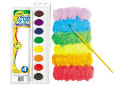 These bold, beautiful watercolors are completely washable! Our set contains bright, nontoxic paint that washes right off of children’s hands, faces and clothing, plus a paintbrush—all in a tough plastic mixing tray. Set includes 8 watercolors.