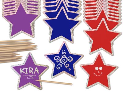 Perfect for name tags, awards or arts & crafts, these sparkly scratch stars make any project shine! Simply use an included stick to scratch away the surface and “draw” shimmery, display-worthy designs. You get 30 stars in 3 colors, plus 30 scratching sticks; stars measure 5".