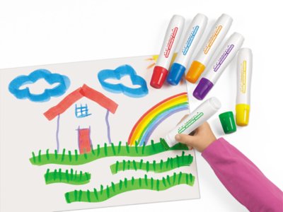 Two unique features in one marker! Our easy-grip, oversized markers feature specially designed jumbo tips for drawing broad strokes or thin, detailed lines—ideal for easel or tabletop use. And don’t be afraid if kids make a mess—the markers easily wash off children’s hands and most fabrics! Set includes 6 nontoxic markers in 6 colors.