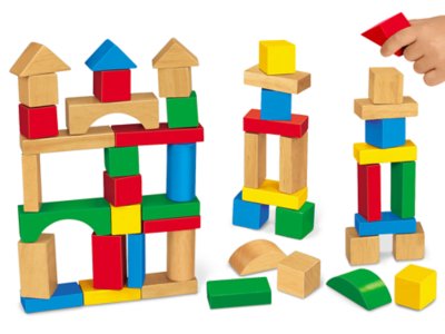A giant set of colorful building blocks—perfectly sized for tabletop play! Our hardwood blocks are just right for small spaces, and they come in 9 shapes and 5 colors...for tons of building fun. Set includes 50 blocks; longest measures 3 1/2".