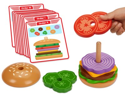 Children build one delicious burger after the next—developing sequencing and fine motor skills as they go! Kids choose a card showing a mix of ingredients, and then stack pieces onto the base to match the order shown. You get 10 activity cards, a wooden base and 7 wooden ingredient pieces. Each card measures 5 1⁄2".