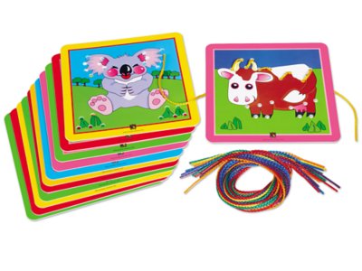 Building eye/hand coordination and fine motor control is more fun than ever…with kid-pleasing picture cards children love to lace! Each cute card is made of indestructible plastic, so children can lace them again and again. Kids just thread the laces right through the holes…and complete each adorable picture! Set comes with 12 cards and 12 laces; cards measure 6 1/4".