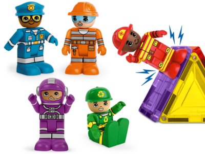 Bring any magnetic tile creation to life with a police officer, an astronaut, a firefighter and more! Featuring magnetic feet, these super-cute community helpers stick right to your tiles—even upside down or sideways—so it’s easy to incorporate imaginative play into construction. And their legs, arms and heads move—for a truly fun and realistic building experience! You get 5 durable plastic figures; each measures 2 1/2" tall. Magnetic Wonder Tiles® sold separately.