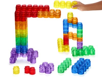 Our see-through builders stack up and down and at tons of angles—to create all sorts of towering, translucent structures! Perfectly sized for small hands, the chunky, snap-connect pieces are great for use on light tables, so kids explore color, reflection and more as they build. Set includes 42 plastic pieces in 5 designs and 6 colors; largest builder measures 6 1/2" in length.