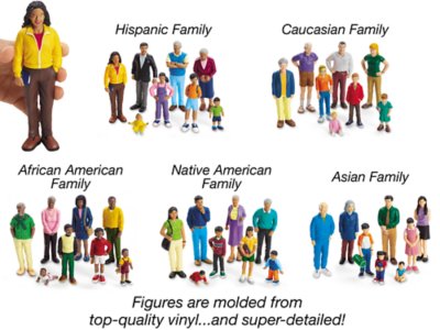 Our multi-ethnic people are perfect for populating play cities and towns…and they’re so durable, we guarantee them for 10 full years! The sturdy figures feature up-to-date styling and lots of authentic details…plus they’re specially molded to actually stand—for added realism and frustration-free play! Each 8-piece family includes a baby, a toddler, a girl, a boy, a woman, a man, an elderly woman and an elderly man. Tallest figure measures 5 1/2". Complete set includes all 5 families shown, for a total of 40 figures in all. Each family also available separately.