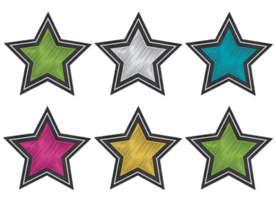 Use these chalkboard-themed star accents to brighten up classroom walls and doors, label bins and desks, or decorate bulletin boards! Pack includes 30 accents in 5 colors; each accent measures approximately 6".