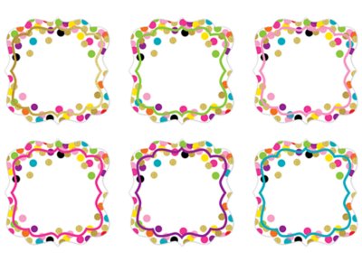 Use these cheerful confetti-themed scalloped mini accents to brighten up classroom walls and doors, label bins and desks, or decorate bulletin boards! Pack includes 36 accents in 6 colors; each accent measures approximately 2 5/8".