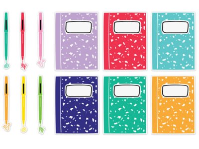 These full-color illustrated cutouts add the perfect finishing touches to any room! Enhance displays…play games…create desk, name and cubby tags…and more—with versatile accents featuring bright notebooks and pens! Pack includes 36 durable, die-cut cardstock accents—18 notebooks in 6 colors, plus 18 pens in 6 colors and 3 designs; notebooks measure 4 7/8" x 6 1/2".