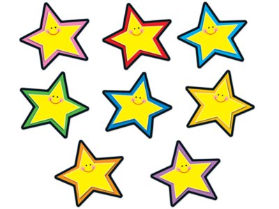 Add some star quality to displays and doors, dress up your classroom, create awards, decor ate lockers and more with these happy cutout accents! With plenty of writing room, the accents can be used as desk or cubby tags, invitations, postcards, flash cards and more. Printed on durable cardstock, the versatile, ready-to-use cutouts are die-cut and reusable when laminated. Pack includes 36 assorted stars outlined in multiple colors; each cutout measures approximately 5 5/8" x 5 7/8".
