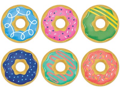 Sweet and delicious-looking, these doughnut accents are topped with colorful icing and sprinkles! The versatile accents are perfect for a variety of classroom displays, bulletin boards and projects. Pack includes 36 accents in 6 designs; each accent measures approximately 3".
