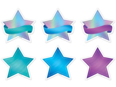 These shimmery, iridescent star accents will add a touch of magic to your day! So simple and versatile, the accents can be used for anything—from accenting a variety of classroom bulletin boards and labeling around the classroom to student projects, flash cards, learning cards and other activity cards. Pack includes 36 accents in 6 designs; each accent measures 3".