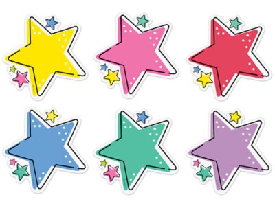 Brighten any room with these colorful star accents. Perfect for class messages, writing assignments, learning center activities, bulletin boards and more, the accents can also be used as quick and easy labels on cubbies, student folders, supply bins and binders. Pack includes 36 accents in 6 colors—yellow, pink, red, blue, green and purple; each measures approximately 5 5/8" x 5 3/8".