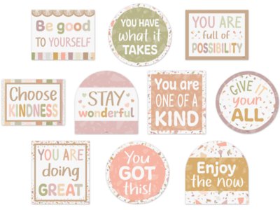 These terrazzo-themed accents are perfect for dressing up classroom walls and doors, labeling bins and desks, or decorating bulletin boards! Pack includes 30 accents in 10 designs with 10 different positive sayings; each accent measures approximately 5 1/2".