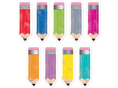These colorful wooden pencil accents are an iconic symbol of school and learning—with realistic-looking worn paint, metal banding and bright colors that give the pencils a familiar yet modern feel! Pack includes 108 accents in 9 designs; each accent measures approximately 6" long.