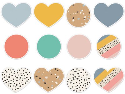 Enhance displays…create cubby, desk and name tags…add finishing touches to bulletin boards…and more—with versatile heart and circle accents in a variety of neutral colors and eye-catching designs that will add some love to any learning space! Pack includes 36 cardstock accents in assorted designs; heart accents measure 5 1/5" x 6 3/10".