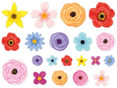 This stunning assortment of flowers in a hand-painted motif is perfect for dressing up classroom walls and doors, labeling bins and desks, or decorating bulletin boards—all while highlighting the beauty of nature! Pack includes 60 accents in 14 colors and 4 sizes; largest accents measure 6 1/4".
