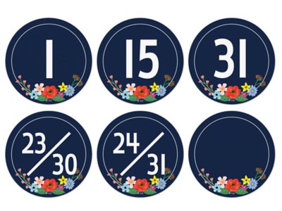 Turn calendar charts into reusable calendars month after month with these navy blue calendar days featuring delicate flowers! Set includes 36 pieces, including numbers 1 to 31, 23/30, 24/31, and 3 blank cards; each measures 2 1/2" x 2 1/2".