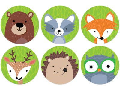 Whimsical woodland animals will brighten any classroom! The accents feature 6 different animals against a leafy green background—a raccoon, a fox, a deer, a hedgehog, a bear and an owl—perfect for use in a variety of classroom displays and themes, including science, nature, the outdoors, animals and camping. Set includes 36 accents in 6 designs; each accent measures approximately 3" in diameter.