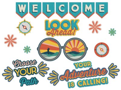 Create a welcoming classroom—and keep your students “looking ahead”—with inviting decor! Featuring an adventure-themed design, this bulletin board set includes 26 pieces—7 letter pennants that spell “WELCOME,” 8 die-cut words and phrases, a pair of die-cut sunglasses and 10 miscellaneous accents; largest piece measures 11" x 23 1/2".