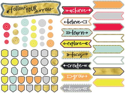Inspire students all year long with this motivational bulletin board set that’s great for visual reinforcement! Featuring a contemporary design, classic arrows and words of encouragement, the set includes 71 pieces—a “Follow Your Arrow” header piece, 8 inspirational arrows, 8 blank arrows, 22 targets in 3 sizes and 6 colors, and 32 student cards in various designs. The header piece measures 5 1/2" x 18 3/4".