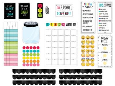 Help learners stay motivated and on task as they learn life skills and strategies for success with this bulletin board set! Designed for use in either classroom or at-home learning environments, the pieces in this set can be used to create engaging, interactive displays that inspire students to stay focused on learning goals and give their best effort every day. Set includes 68 pieces—a color-coded incentive chart, a feelings chart with 21 emoji face pieces, a “Stick with It!” chart, a goal jar, 30 tokens, 2 motivational posters, an “Actions Matter” mini poster, a “Tips for Learning Success” mini poster, a learning stoplight and a paper clip, a stand-up inspirational table topper, 6 border strips measuring 3" x 24" and 2 1/2" x 23 1/2"—and an instructional guide with activity ideas, display suggestions and a reproducible page. “Stick with It!” chart measures 17 1/2" x 24".