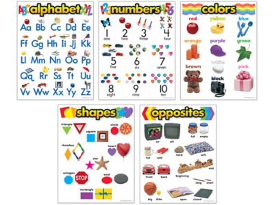 This convenient bulletin board set covers numbers, the alphabet, colors, shapes and opposites—great for early childhood and kindergarten students! Plus, each chart features colorful photographs of common objects to aid children’s understanding…and they’re printed with vivid inks on durable tagboard for years of use! Set includes 5 charts; each measures 17" x 22" and includes multiple reproducible activity sheets on back.