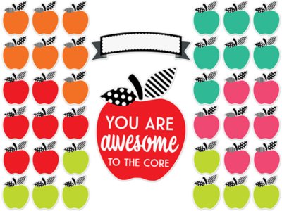 Featuring pops of color and fun, eye-catching patterns to spark children’s imaginations and curiosity, this bulletin board set helps create a classroom environment where students celebrate their individuality! The set includes 38 pieces—a large “You Are Awesome to the Core” apple, a blank banner and 36 apple accents in 5 colors; largest piece measures 16 1/3" x 17 2/5".