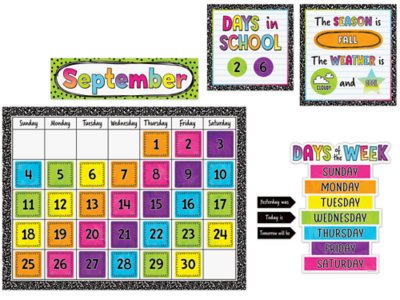This ’90s-throwback bulletin board set comes with everything you need for a complete classroom calendar—from easy-to-read number pieces and colorful monthly headers to a “Days of the Week” sign and arrows that indicate what “Today Is,” what “Tomorrow Will Be” and what “Yesterday Was”! Set comes with 141 total pieces, including a blank calendar, holidays and special occasions, seasons and weather pieces, and more; blank calendar measures 18" x 24".