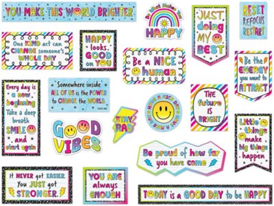 Inspire students all year long—and remind them that every day is a good day to be happy—with this motivational bulletin board set that’s great for visual reinforcement! Featuring ’90s-inspired designs, bright colors and words of encouragement, the set includes 19 pieces featuring positive sayings. Largest piece measures 3" x 21".