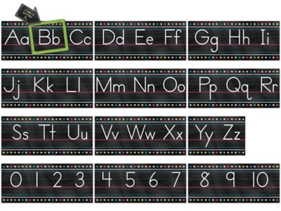Display the upper- and lowercase letters of the alphabet and numbers 0-10 using this chalkboard-style bulletin board set—it’s a handy reference for young students! Set includes 14 pieces—12 letter and number panels, plus a frame and an arrow that can be used to highlight the letter of the day—and a teacher’s guide with suggested activities. Each 3-letter panel measures 7 1/2" x 17 1/2".