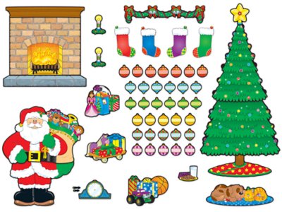 Celebrate and welcome the holiday season with this festive, Christmas-themed bulletin board set! The set includes over 50 pieces—a Christmas tree, a Santa figure, a fireplace with removable flames, 4 stockings, a garland, 34 ornaments, a clock with movable hands, 2 candles, a milk-and-cookies accent, a pets-on-a-rug accent and 3 stacks of presents. Assembled Christmas tree measures approximately 23" x 49".