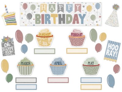 Students will love discovering their birthday on this celebratory bulletin board with varied patterns and color combinations in a cozy color palette. Set includes 67 pieces; header piece measures 21" x 6".