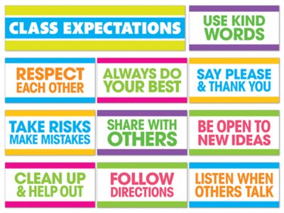 Keep students on track with a colorful bulletin board set that prompts positive classroom behavior! Use the pieces as friendly reminders of what’s expected in class and to support classroom management. Set includes 11 pieces—a “Class Expectations” header piece and 10 concise, easy-to-read rules to follow; header piece measures 6" x 24".
