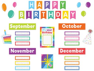 This bright, upbeat bulletin board set will bring an air of cheery celebration to students’ birthdays! The colorful set comes with one label for each month of the year and 36 tags to display names under the months, plus 13 letter pennants that spell “Happy Birthday,” a decorative frame and 9 accents. Set includes 71 pieces; the pennant letters measure approximately 2" x 3".
