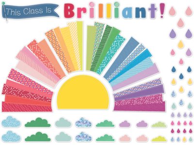 Inspire students year-round with this bright and brilliant classroom set! Use the raindrop accents to display student names, showcase student work underneath the inspirational banner, create vibrant wall decor and decor ate your bulletin board, whiteboard and more! Includes 69 pieces; assembled sun measures 25 3/8" x 44 3/5".