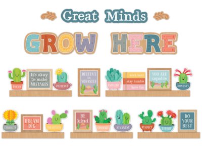 Bring some desert charm to your classroom! This vibrant set features cheerful cactus characters and motivational messages, ideal for encouraging growth and positivity in young minds. Perfect for any classroom or learning space, it’s a fun way to remind students that great minds truly grow here! Set includes 30 pieces; largest piece measures 5 1/2" x 18 1/4".