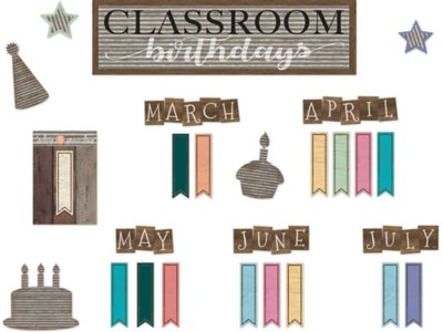 Add a touch of rustic charm to your students’ birthdays with this homey birthday bulletin board set! The colorful set comes with 58 total pieces—a “Classroom Birthdays” title piece, one label for each month of the year, 39 tags to display names under the months, a “Today Is Your Day” sign and 5 accent pieces. Set includes a guide with suggestions and activities. The largest piece measures 6" x 21".