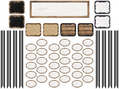 Reinforce a strong work ethic with this job assignment bulletin board set for the classroom! Featuring a modern fusion of reclaimed wood and natural elements, the set includes 47 pieces to create a functional display—a customizable header piece, 8 frames, 8 ribbon strips and 30 student cards. The header piece measures 6" x 21".
