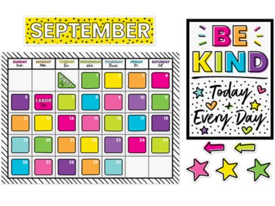 This calendar bulletin board set makes it easy to keep track of the schedule, special occasions and more—featuring bold colors, fun patterns and a touch of style that will make your classroom super-trendy! Set includes 129 pieces; blank calendar measures 17" x 23".