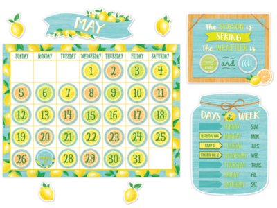 This zesty citrus-inspired bulletin board set comes with everything you need for a complete classroom calendar—from easy-to-read number pieces and colorful monthly headers to a “Days of the Week” sign and arrows that indicate what “Today Is,” what “Tomorrow Will Be” and what “Yesterday Was”! Set comes with 97 total pieces, including a blank calendar, holidays and special occasions, seasons and weather pieces, and more; the blank calendar measures 18" x 24".