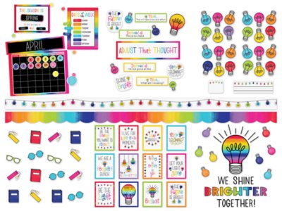 This all-in-one decor bundle includes everything you need to incorporate a colorful, light bulb–inspired theme throughout your classroom—from bulletin board accents and borders to posters and nameplates! The bundle includes everything shown—over 385 pieces total; the blank calendar measures 17" x 23".