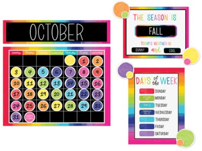 This calendar bulletin board set makes it easy to keep track of the schedule, the seasons and the weather—featuring super-bright colors, watercolor effects and trendy designs that are perfect for any contemporary classroom that embraces inspiration! Set includes 103 pieces; blank calendar measures 17" x 23".